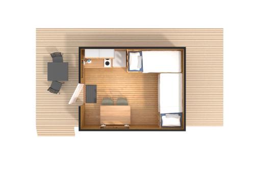 Denna villavagn har en matplats, parkettgolv, värme samt delat badrum. I det välutrustade pentryt finns spishäll, kylskåp och köksgeråd. Villavagnen med egen ingång har en te- och kaffekokare, en sittgrupp och en terrass med sjöutsikt. Här finns 4 sängar.